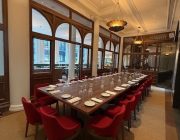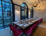 The ground-floor dining room, framed by large windows, is bathed in natural light, showcasing the building’s original details and offering a relaxed yet sophisticated atmosphere.